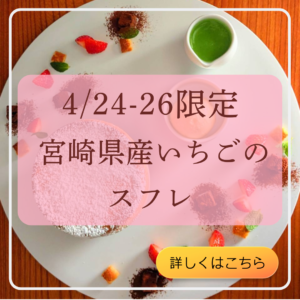 大人気の”いちごのスフレ”。今年最後となりますのでお見逃しなく! 宮崎県産いちごのスフレバニラアイスクリームとピスタチオソース デザートスフレセット 2,500円(税込)(スフレ、お茶菓子 2種類、お好きなお飲み物(お替 […]
